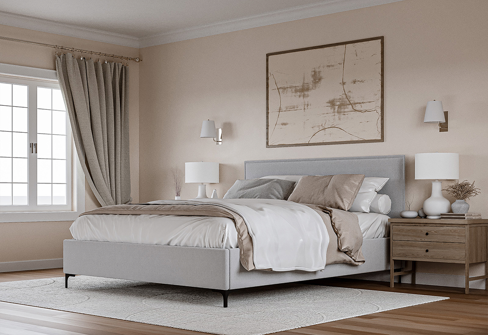 גב המיטה הגבוה מוסיף מראה מרשים לחדר השינה,